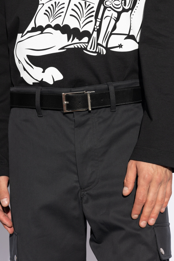 Introducing the pinnacle of sartorial elegance and versatility, the Reversible Belt from the exclusive Burberry collection. This accessory encapsulates the essence of refined style with its grey hues and intricate, geometric patterns reminiscent of diamonds or pyramids. Crafted with an astute attention to detail, it features a robust and durable outer layer composed of a sophisticated blend of polyurethane and cotton, with a luxurious leather inner layer. The belt's standout feature is its sleek, rectangular metallic buckle, which not only adds a touch of sophistication but also ensures a secure and adjustable fit. Whether showcased on trousers through its seamless integration with various attire or admired for its detailed craftsmanship when laid flat, this belt is a testament to Burberry's commitment to superior quality and innovative design. The reversible nature of the belt offers the wearer the freedom to switch between styles, making it a versatile addition to any wardrobe. Why purchase this product? Versatility: Reversible design allows for multiple style options. High-Quality Materials: Durable outer layer with a luxurious leather interior. Exquisite Craftsmanship: Iconic geometric pattern and superior construction. Elegant Accessory: Elevates any attire with Burberry's signature aesthetic.