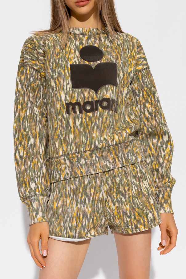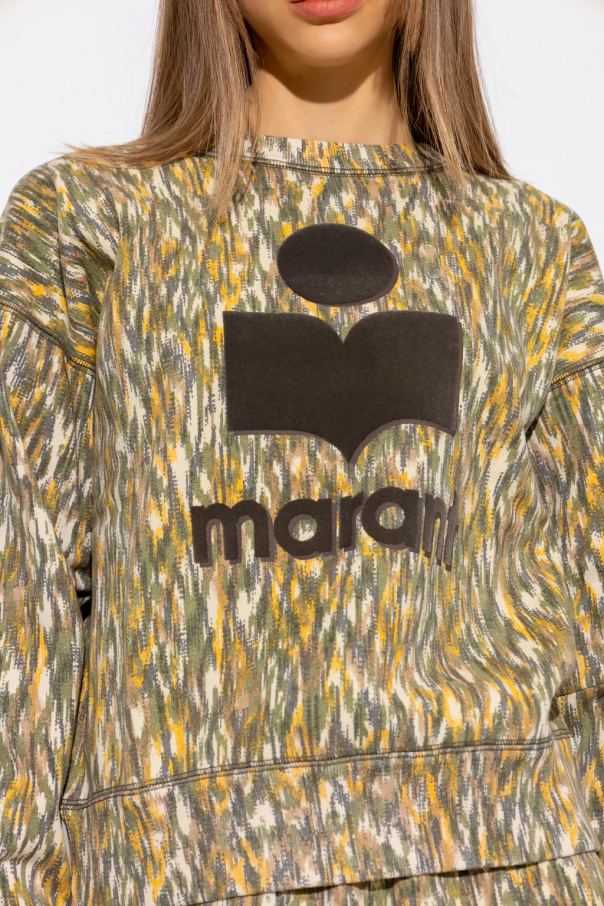 Green ‘Mobyli’ crewneck sweatshirt from Isabel Marant Etoile. Crafted from cotton jersey, this style showcases a colourful graphic pattern, a khaki velvet-flocked logo on the front and ribbed trims on the collar, bottom hem and cuffs.