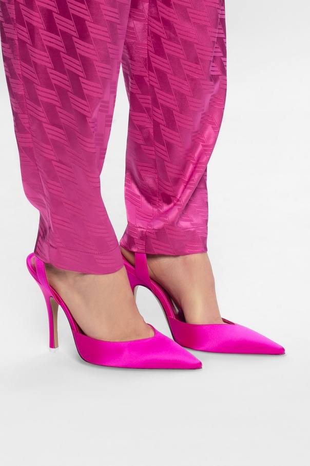 Pink 'Lola' pumps from The Attico. Crafted from satin-like material, this slingback pair rests on a beige leather sole and features pointed toe and goat leather trims.
