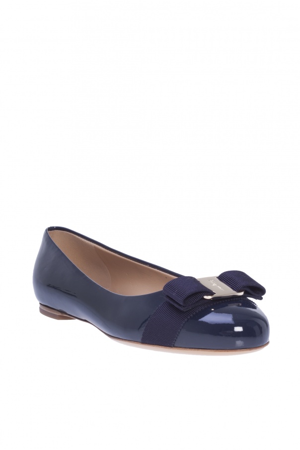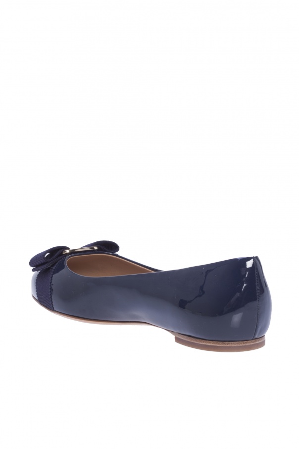 Navy ‘Varina’ ballet flats from Salvatore Ferragamo. Crafted from patent calf leather, this design features a ribbed grosgrain Vara bow with a logo-embossed appliqué in gold-tone and a beige leather sole.