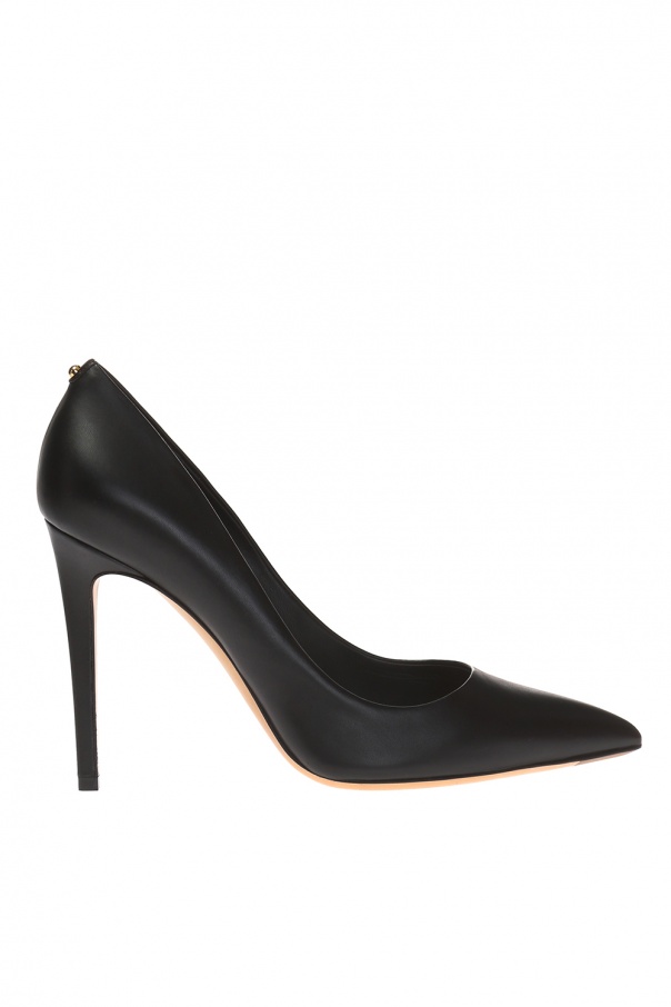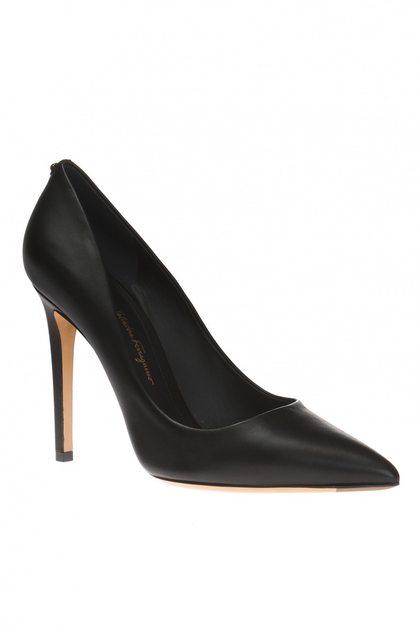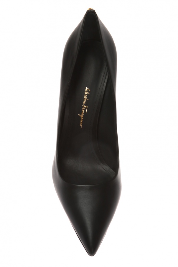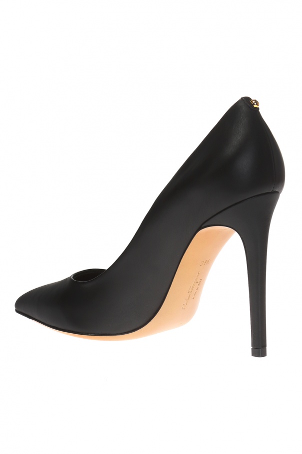 Black 'Alba X5' stiletto pumps from Salvatore Ferragamo. Made of calf leather. Enriched by a gold-tone 'Gancini' detail at back. Brown leather sole.