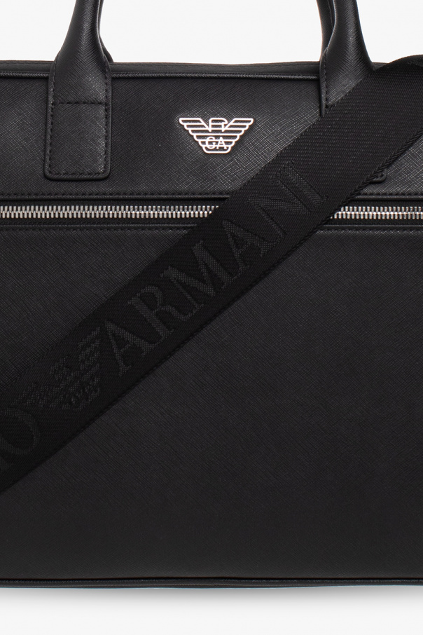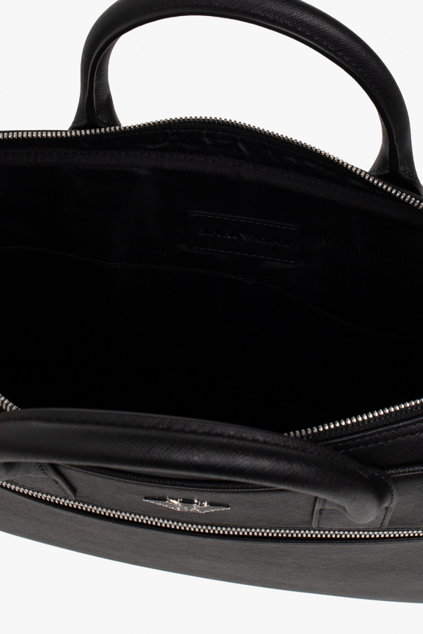 Black briefcase from Emporio Armani. Crafted from faux leather, this design features a zip fastening, a logo application, two half-round handles, silver-tone metal hardware, one slip pocket and one zip pocket on the front and back and one internal compartment with a slip pocket.