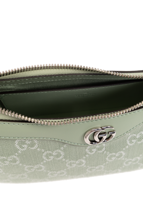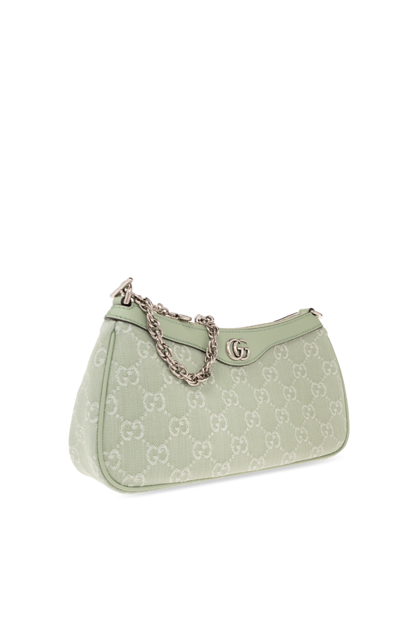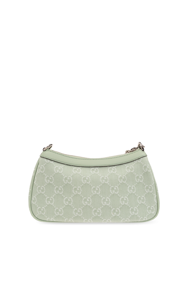 Light green ‘Ophidia Small’ shoulder bag from Gucci. Made of canvas embroidered with a monogram and calf leather trims, this model features a zip fastening, metal Double G logo, detachable chain, adjustable strap, silver-tone metal hardware and one internal compartment with one slip pocket.