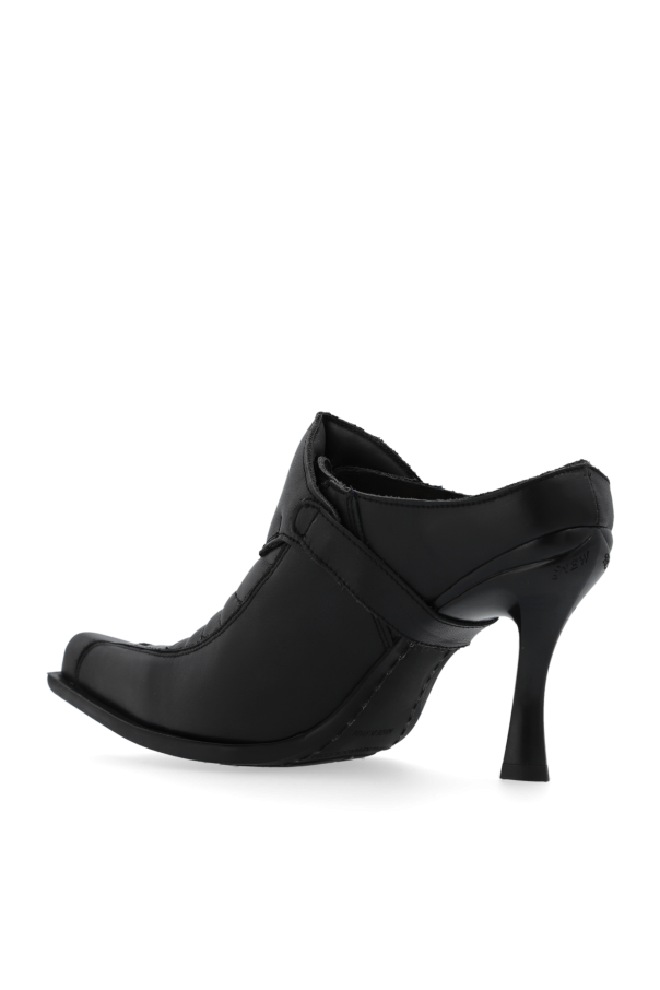 Black mules from VETEMENTS x New Rock. Made of leather with a pointed-toe silhouette, this model sits on a black rubber sole and showcases an embossed logo on the front and back, horizontal stitching and a side strap with an antiqued silver-tone logo buckle.