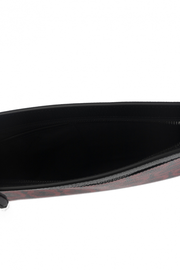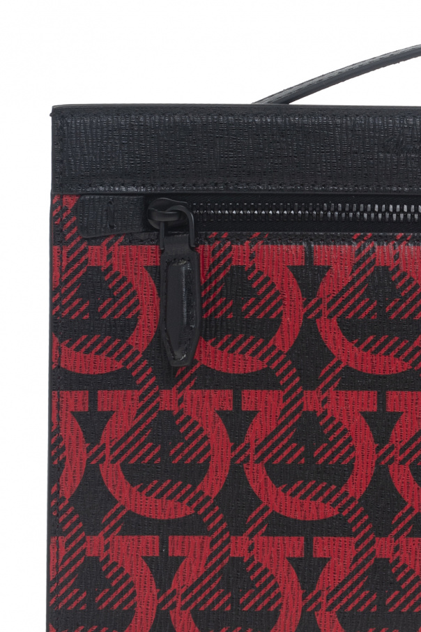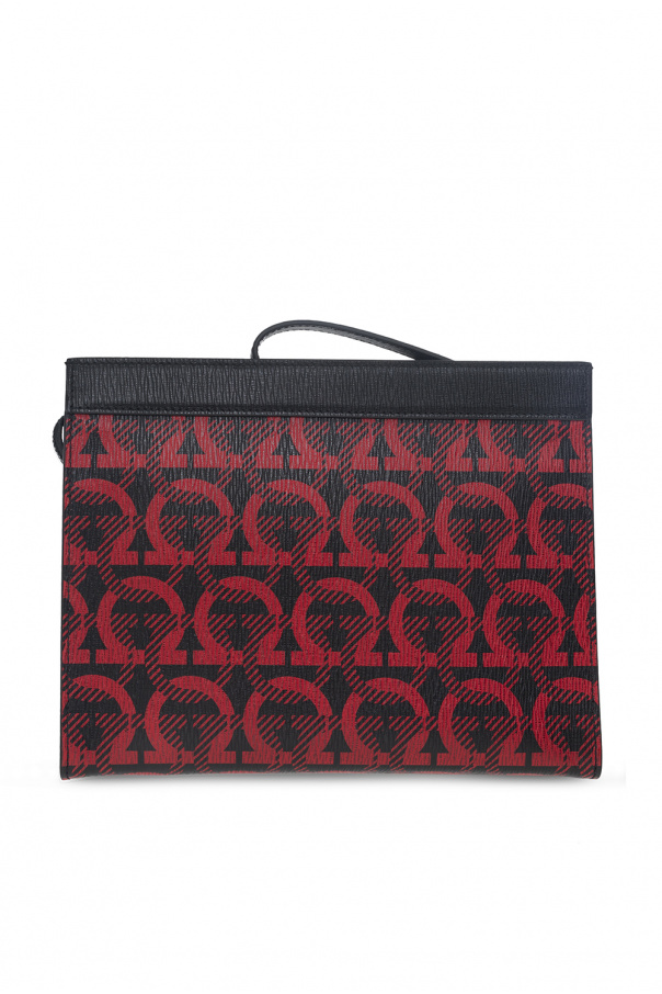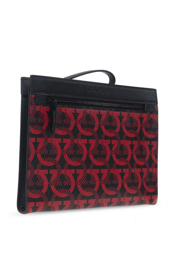 Black handbag from Salvatore Ferragamo. Made of calf leather, this model features a zip fastening with a wrist strap, red monogram print, front zip pocket, black metal hardware and one internal compartment with two slip pockets.