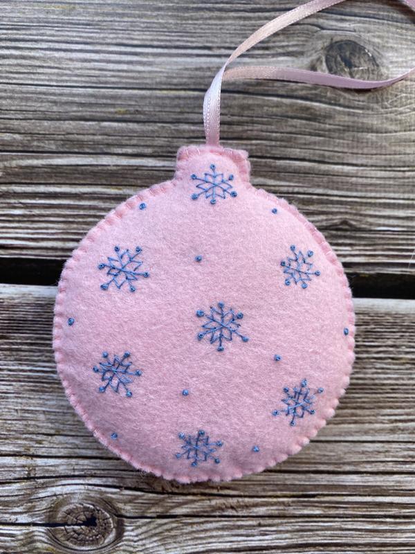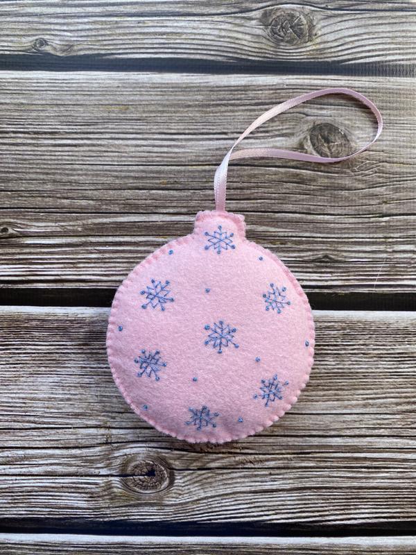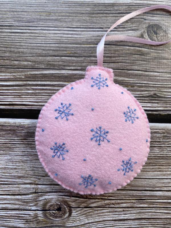 Іграшка з американського фетру ( вовна+віскоза) ялинкова, новорічна, бавовняна нитка, наповнювач-холлофайбер. Ручна робота, вишивка з обох сторін. Діаметр кулі -9 см. Довжина петлі-11 см. Ця ніжна, засніжена куля додасть Вашій ялинці настрою зими, веселощів та очікування дива або стане душевним подарунком близькій людині