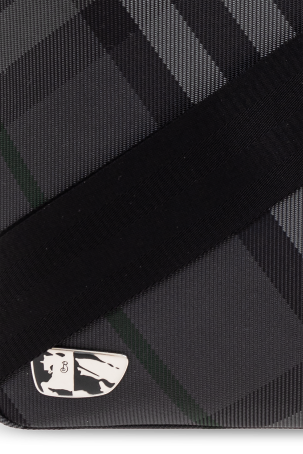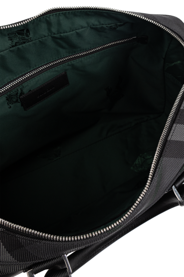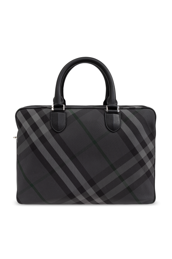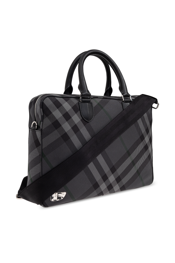 Introducing the Burberry Shoulder Strap Briefcase, a paragon of sophistication from our exclusive men's collection. This briefcase features a rectangular silhouette adorned with a classic plaid pattern in shades of gray with subtle green lines, reminiscent of the brand's luxurious heritage. Crafted from durable high-quality materials, most likely nylon or a technical fabric, it showcases leather handles and trim, imbuing it with elegance and resilience. The briefcase is equipped with two sturdy handles for hand-carrying and a detachable, adjustable shoulder strap, ensuring versatility and functionality. A metallic designer logo plaque graces one corner of the briefcase, while the robust dual zipper closure secures your essentials. The interior, lined in green with black accents, reflects meticulous attention to detail and features a zippered pocket along with additional compartments for small items. Why You Should Buy This Product? Elegant Design: Timeless plaid pattern with luxurious leather accents. Versatile Use: Ideal for daily office use and business meetings. High-Quality Materials: Durable and sophisticated technical fabric with leather details. Functional Interior: Includes a main compartment, zippered pocket, and slip pocket. Exclusive Brand: Designed by Burberry, a renowned name in luxury fashion.