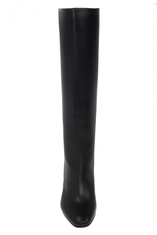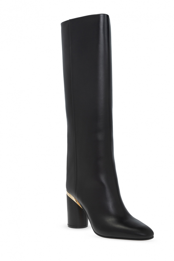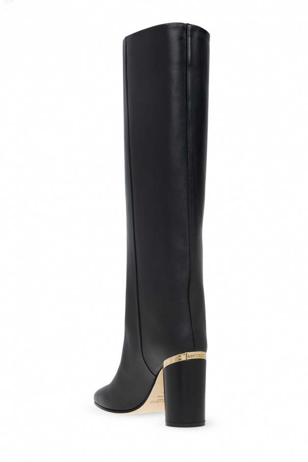 Black ‘Jayla’ heeled boots from Jimmy Choo. Made of calf leather, this slip-one pair features a heel with a gold-tone logo-embossed appliqué and light beige sole made of leather and rubber.