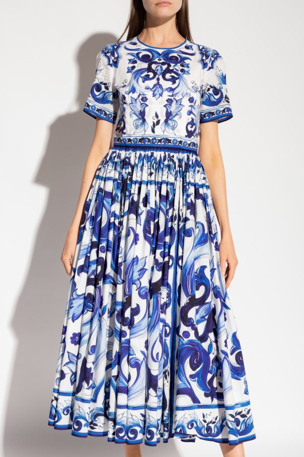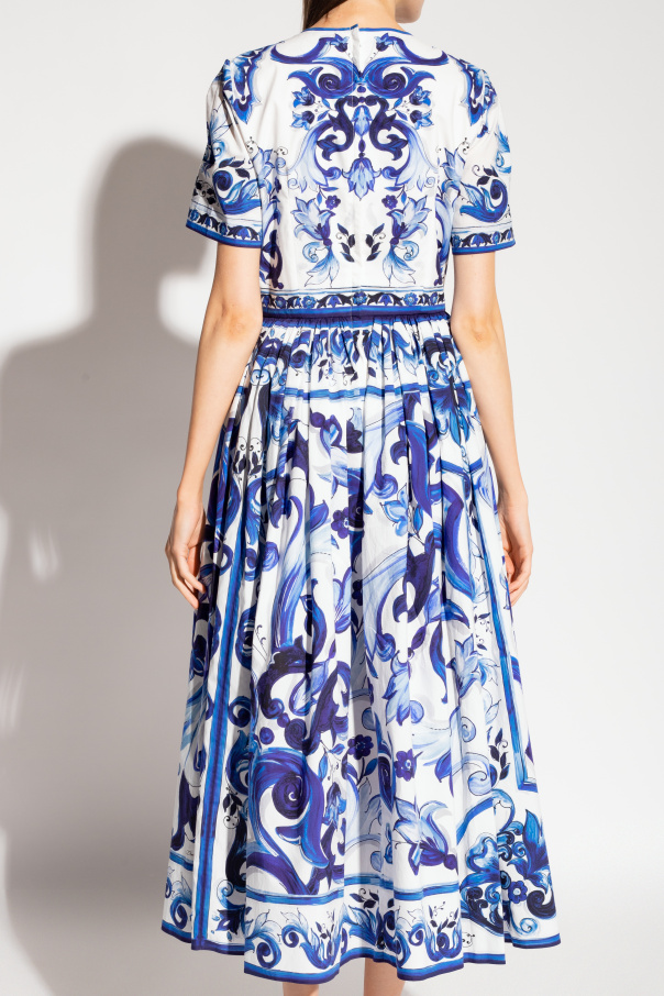 Blue and white dress from Dolce & Gabbana, the ‘Blu Mediterraneo’ collection. Made of cotton, this garment features a concealed zip and hook, flared midi skirt, round neck, short sleeves and floral motif inspired by majolica tiles.