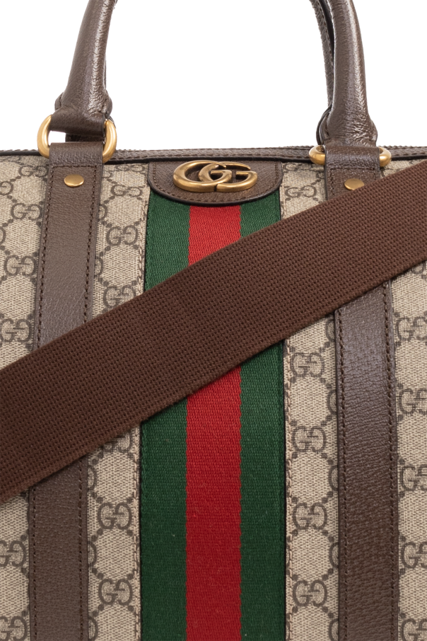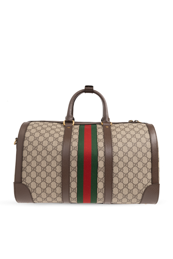 Beige and brown ‘Savoy Small’ duffel bag from Gucci. Made of ‘GG Supreme’ and trimmed with calf leather, this design secures with a two-way zip and showcases green-red-green ‘Web’ stripe detailing, an attached charm with a gold-tone print and hidden key, two half-round handles connected via a snap, gold-tone metal hardware and one internal compartment with two zip pockets.
