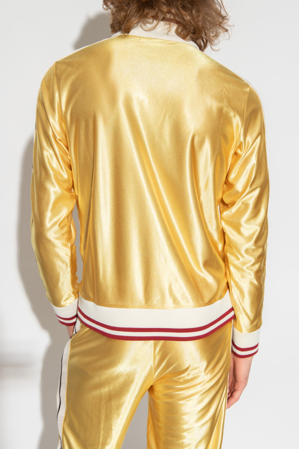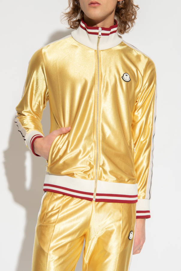 Yellow sweatshirt with a standing collar from Moncler Genius, the ‘Palm Angels no.8’ collection. Crafted with a glossy finish, this style features a zip fastening, cream and brown rib-knit trims on the edges, a logo patch and two zip pockets on the front and cream and black fabric taping on the sleeves.