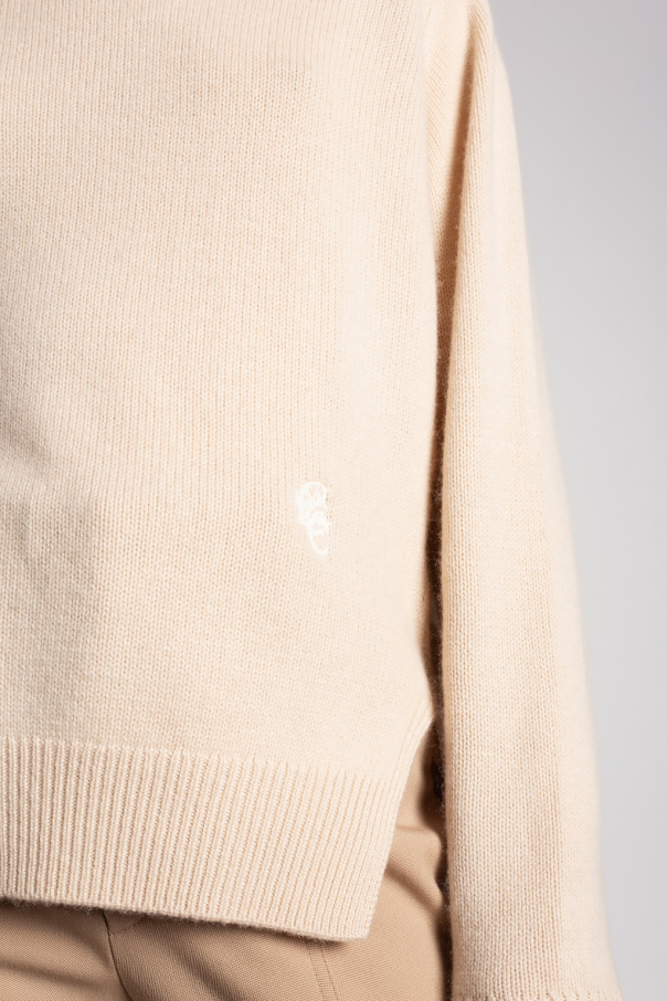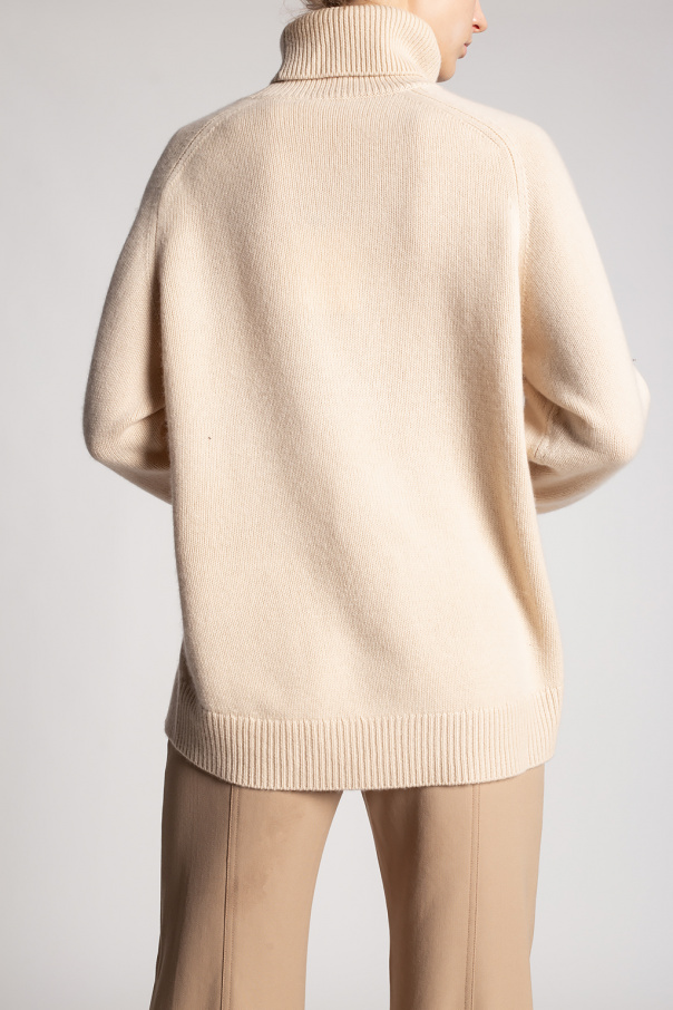 Cream rib-knit turtleneck sweater from Chloé. Crafted from cashmere, this style showcases long sleeves, side slits and the brand's logo embroidered on the front.