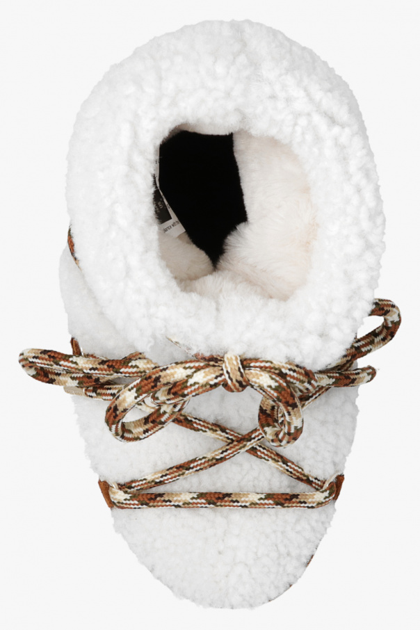 Brown and cream ‘Light Low’ snow boots from Moon Boot. Made of suede with shearling trims, this pair features double tie fastenings and rubber sole in cream and brown. Inspired by the peculiar shape and technology of the astronauts’ boots, the iconic style was designed in 1969 after the first Moon landing.