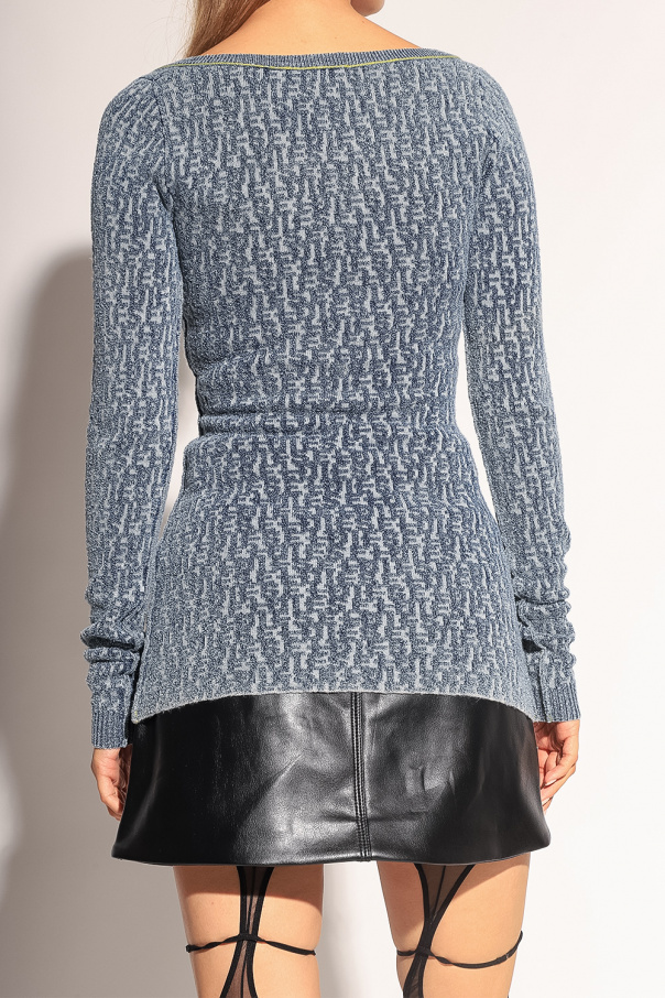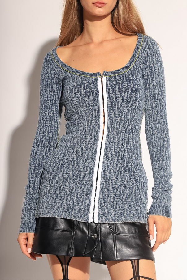 Blueish grey ‘M-ERCILLA’ cardigan from Diesel. Crafted from a cotton and wool blend with a texture, this style showcases a jacquard logo pattern all-over, hidden hook & eye closures on the front, distinctive light green stitching details and an elasticated round neck and long sleeves.