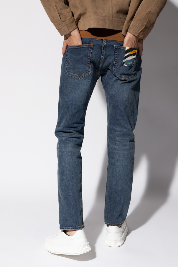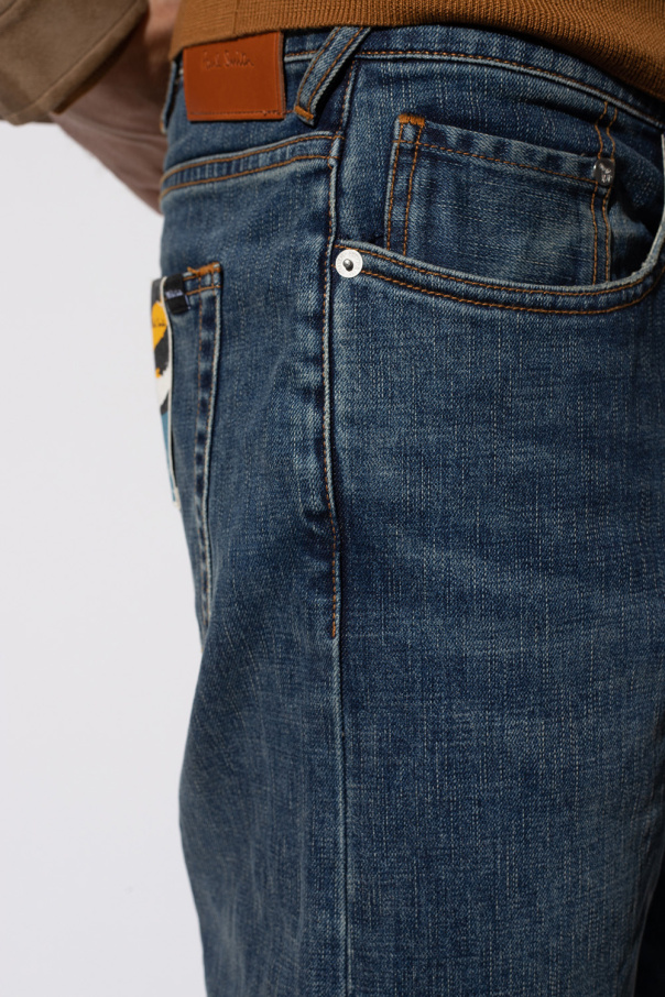 Navy distressed jeans from PS Paul Smith. Made of cotton, this pair falls down with slightly tapered legs and is complete with five slip pockets.