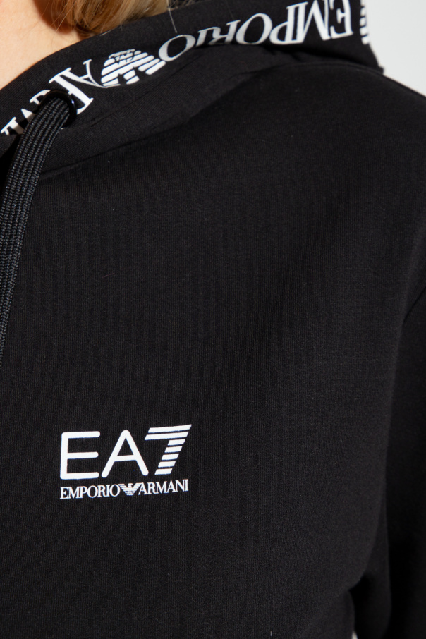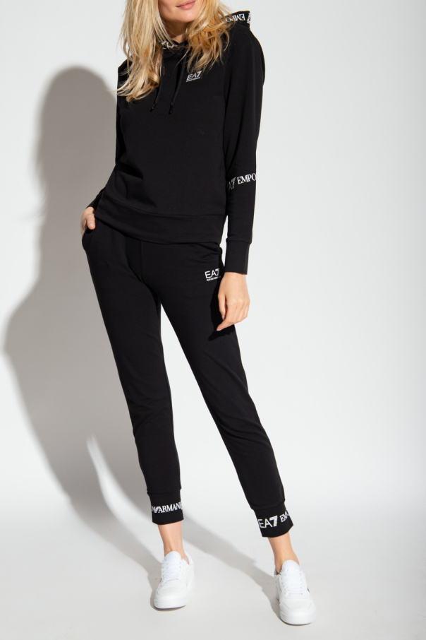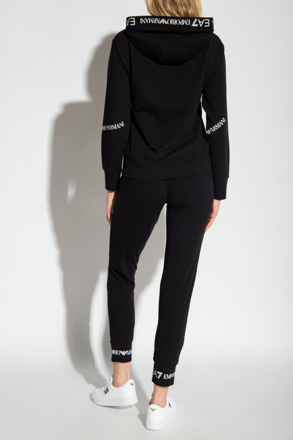 Black sweatsuit from EA7 Emporio Armani. Made of cotton and printed with a white logo, this set includes a sweatshirt with a drawcord-adjustable hood and elasticized trims on the bottom hem and cuffs and sweatpants with an elastic waistband and cuffs and two slip pockets.
