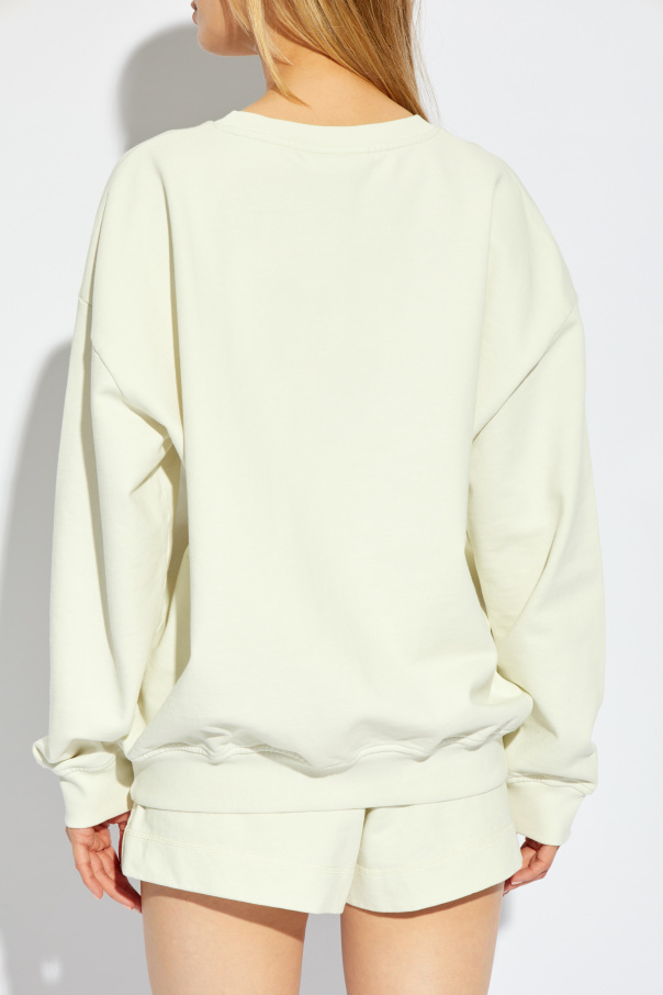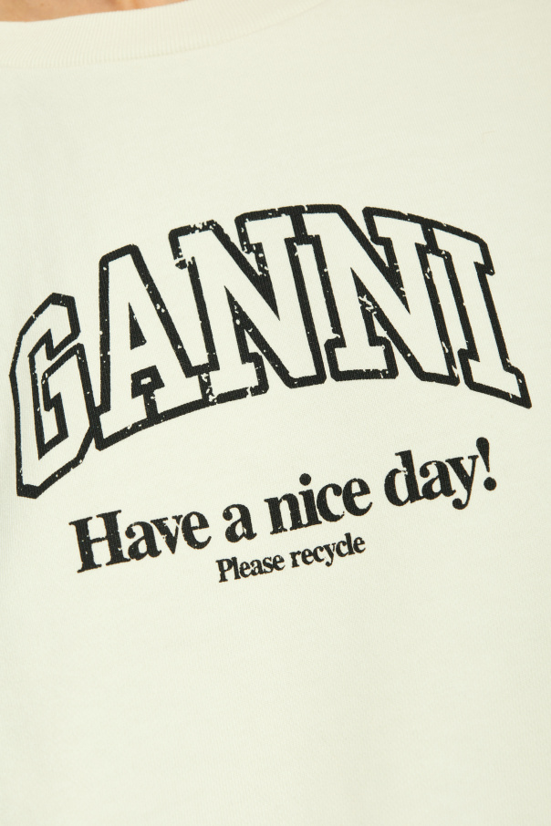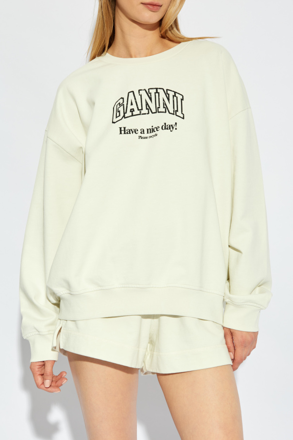 Introducing the Ganni Logo Sweatshirt, a piece that redefines casual elegance with its understated charm and a whisper of rebellion. Crafted from 100% cotton, this sweatshirt promises not only supreme comfort but also a gentle touch against your skin, thanks to its smooth texture. The pale green hue, almost pastel, offers a fresh and serene canvas, upon which the bold, collage-style black "GANNI" lettering takes center stage. Below the main logo, the phrases "Have a nice day!" and "Please recycle" add a playful yet meaningful reminder of the brand's commitment to positivity and sustainability. Designed with a traditional round neckline and fitted with elastic cuffs and hem, this long-sleeved sweatshirt ensures a snug and flattering fit. Its versatility is showcased through styling options, as seen on the model who pairs it with matching shorts and black cowboy boots, creating a look that's both cohesive and chic. Why Purchase This Product? Exclusive Design: Stand out with the unique collage-style branding and inspirational messages. High-Quality Material: Enjoy the soft, breathable comfort of 100% cotton. Versatile Styling: Easy to dress up or down, perfect for any casual occasion. Eco-Conscious: Align with your values through the brand's playful nudge towards recycling.