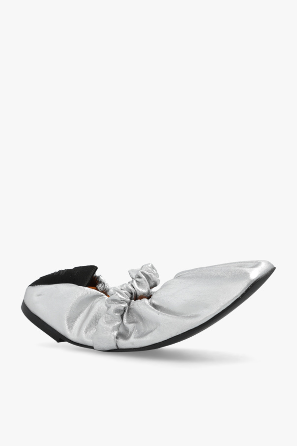 Silver-tone ballet flats from Ganni. Made of recycled fabric, this pair features an elastic strap, square toe, black fabric insert with a logo print at the back and black rubber sole.