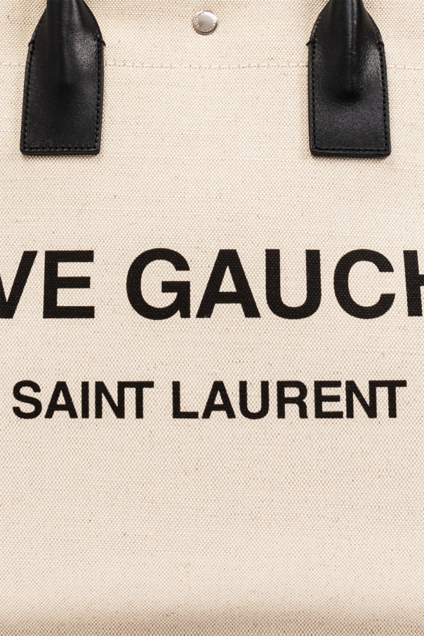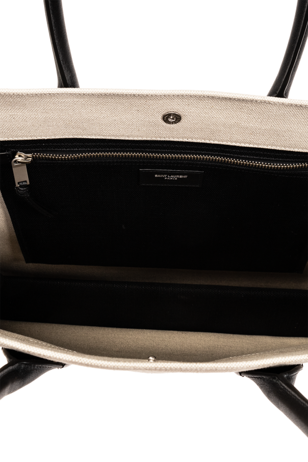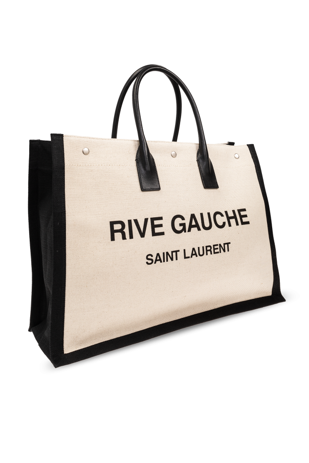 Cream and black ‘Rive Gauche Large’ shopper bag from Saint Laurent. Made of canvas with leather trims, this model features snap fastenings, a black logo print, two half-round handles, silver-tone metal hardware and one internal compartment with one zip pocket.