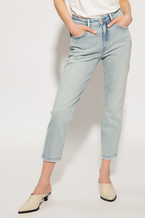 Light blue ‘2004’ slim-fit jeans from Diesel. Made of cotton from sustainable farms, this pair falls with tapered, cropped legs and features a zip fly with a button, classic five pockets and red logo embroidery on the back.