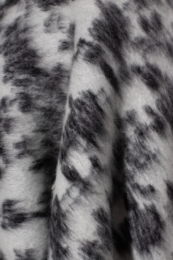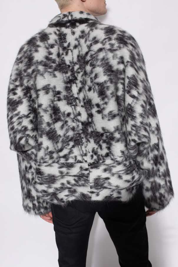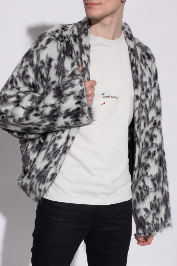 White and black cardigan from Saint Laurent. Crafted from a mohair and wool blend, this style showcases a floral motif, two slip pockets and long sleeves.