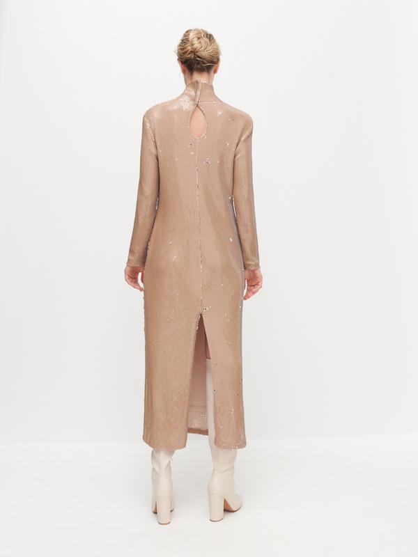 Шикарное нюдовое длинное вечернее платье Reserved в пайетки. В наличии размеры 38, 40. Платье на подкладке. Воротник стойка, сзади застегивается на 4 скрытые пуговицы. Есть небольшие подплечники. Сзади посередине на юбке разрез.
