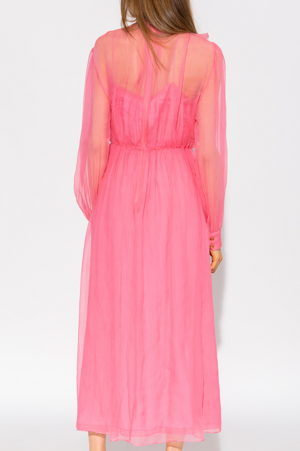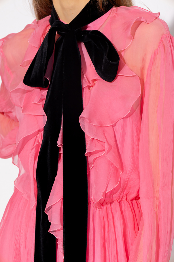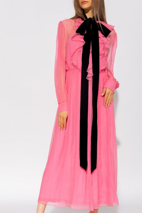 Pink ruched dress from Gucci. Made of silk, this design features a back zip, stand collar with buttons, decorative velvet tie and long sleeves with button cuffs.