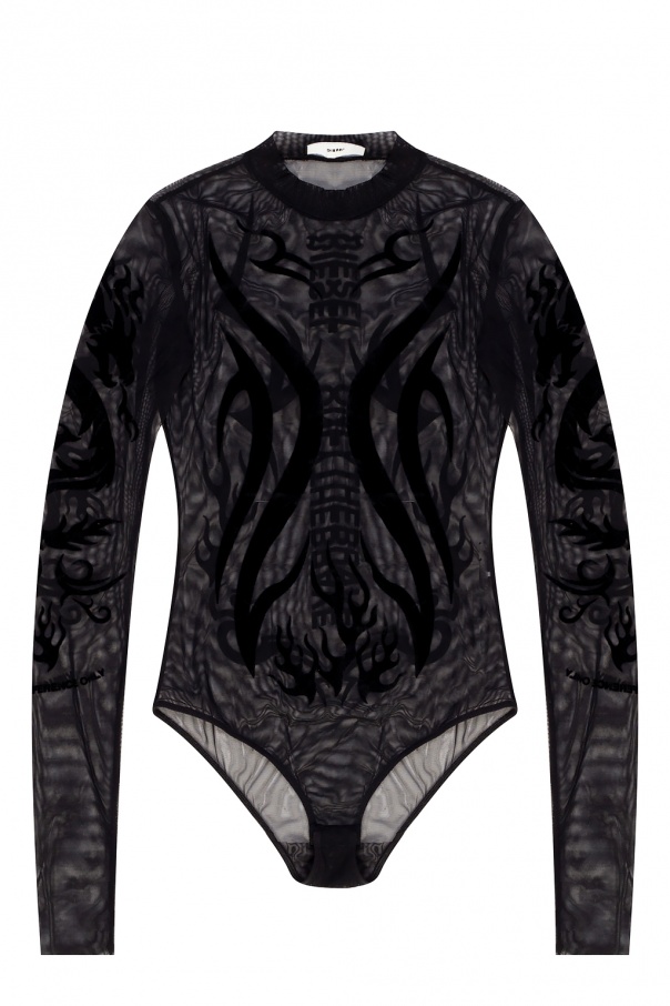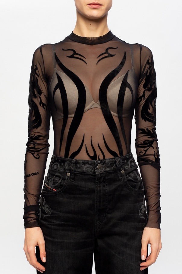 Black body from Diesel. Crafted from semi-sheer mesh fabric, this long-sleeved design fastens via snap-buttons and showcases black flock prints with logo.