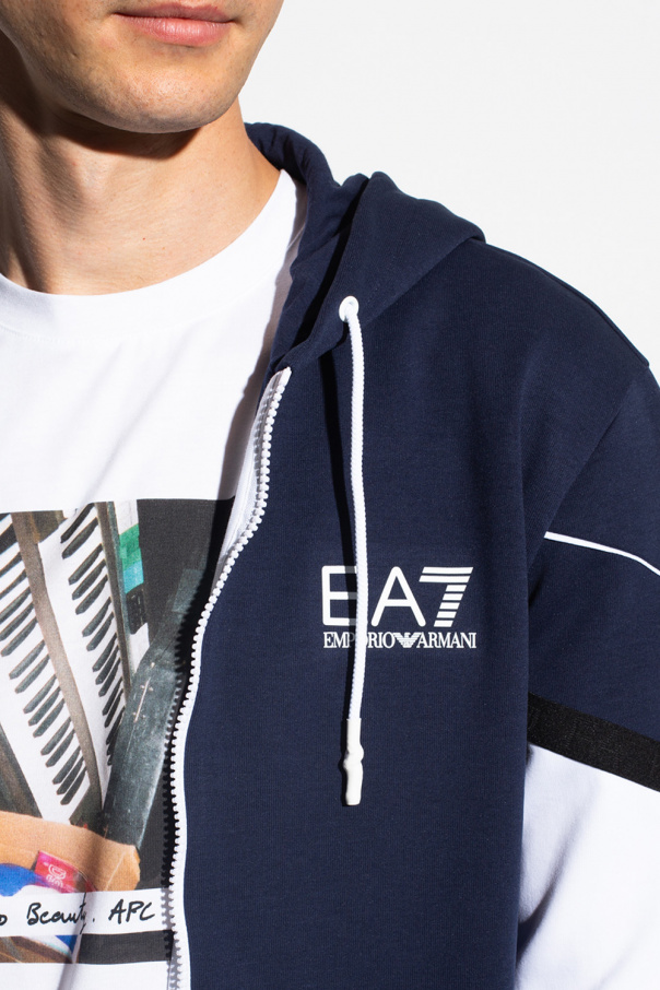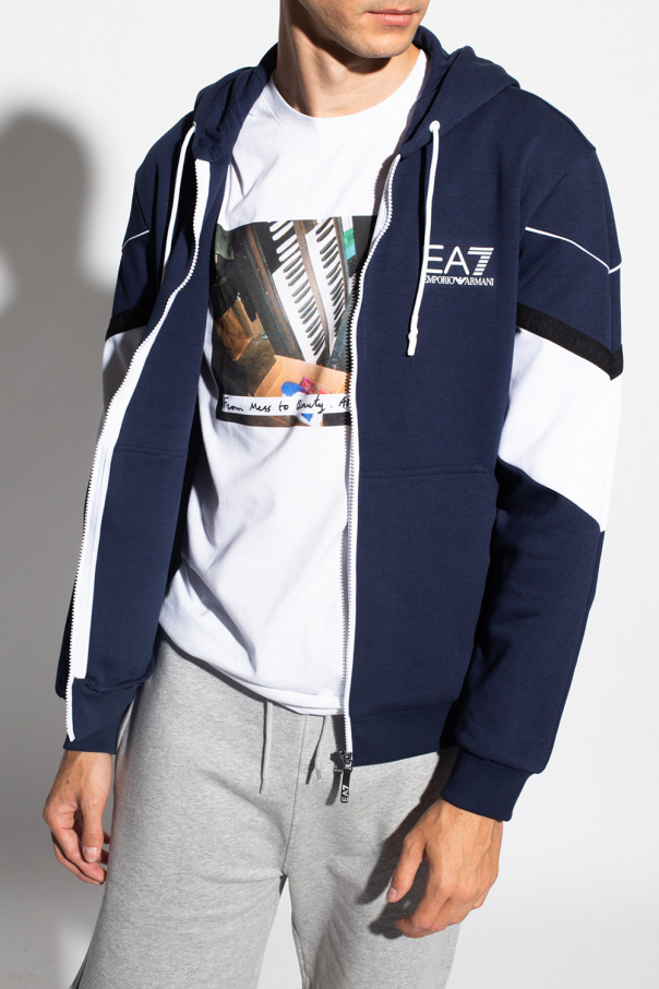 Navy and white hoodie from EA7 Emporio Armani. Fastened with a zip, this garment features a white logo pattern, two slip pockets, drawstring hood and ribbed trims at the neck and hem.