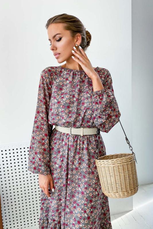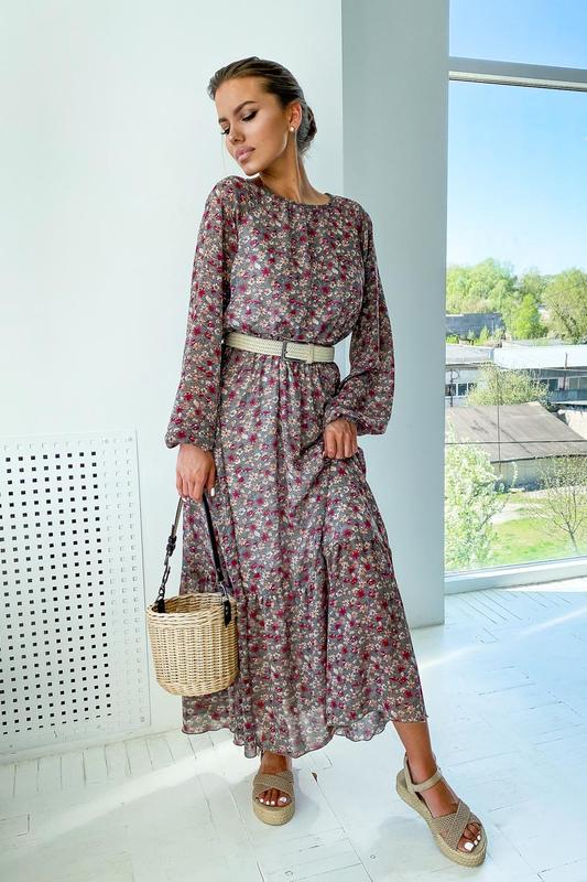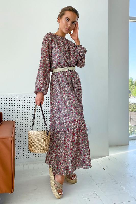 Длинное платье выполнено из принтованного итальянского креп-шифона. Свободный крой, пышная юбка расклешенная. По горловине сборка, по низу платья притачная рюша. Длинные объемные рукава. Застегивается на пуговицу.
