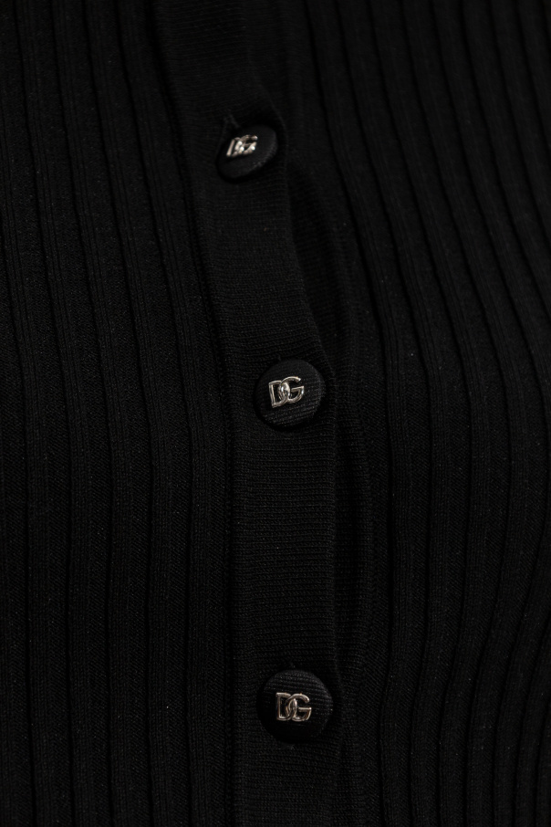 Black cropped cardigan from Dolce & Gabbana. Made of ribbed knit fabric, this long sleeve design features logo buttons and a ribbed crew neck.