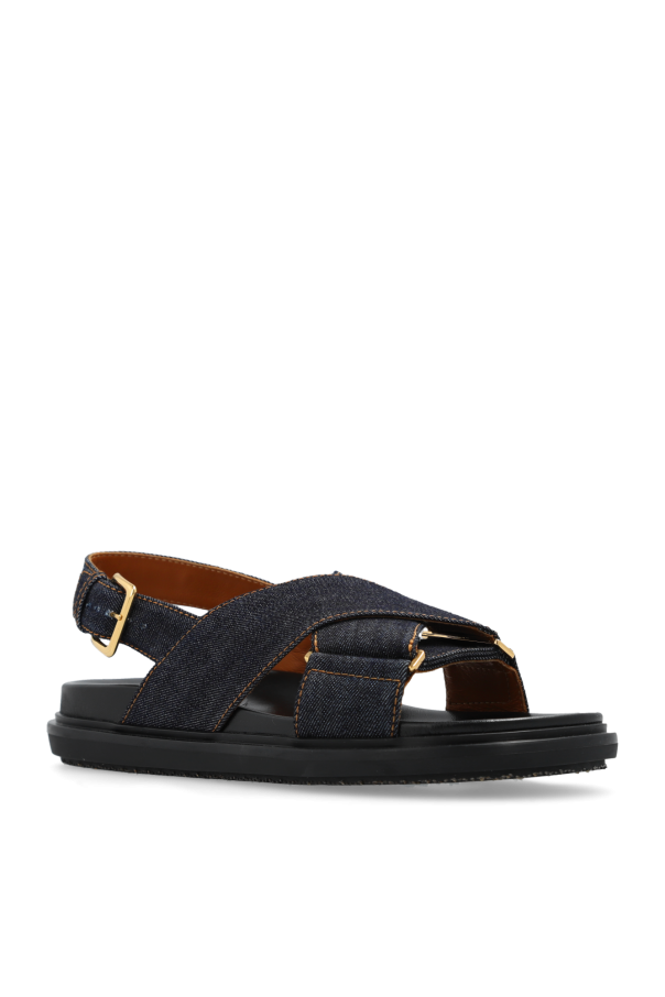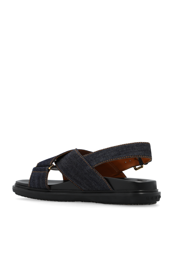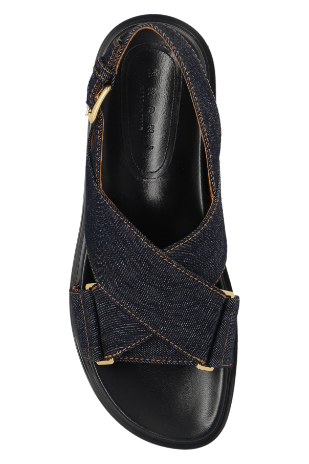 Navy blue ‘Fussbett’ sandals from Marni. Rendered in denim, this model sits on a black rubber sole with a jute overlay and features a raised logo on the back and velcro closures.