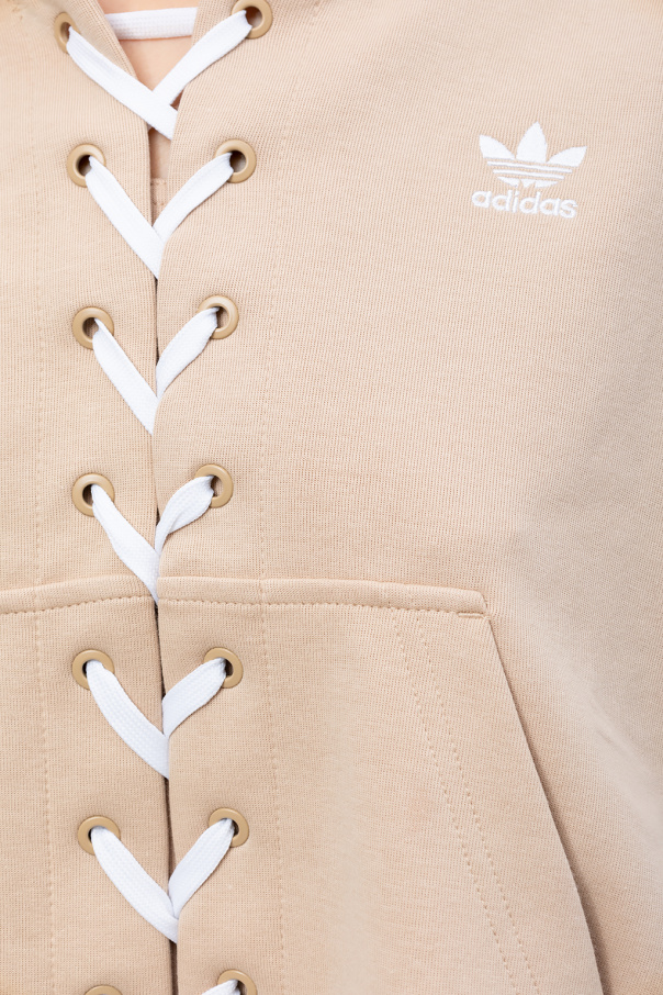 Beige cropped hoodie from ADIDAS Originals. Made of cotton from sustainable production as part of the ‘Better Cotton Initiative. Fastened with decorative lacing, this garment is complete with a white logo embroidery, two slip pockets, the brand’s signature three stripes and ribbed trims at the hem and cuffs.