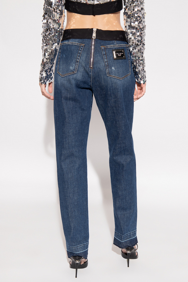 Dark blue distressed jeans from Dolce & Gabbana. Fastened with a back zip, this pair is complete with a black elastic waistband embroidered with a white logo, metal appliqué with logo-embossed leather, two slip pockets, straight legs and raw cut edges.