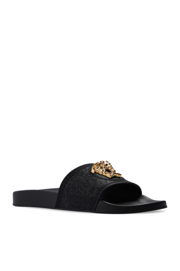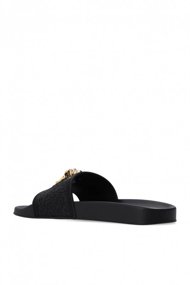 Black slides from Versace. Made of rubber, they showcase the brand's iconic motif of Medusa and Greek and Barocco patterns.