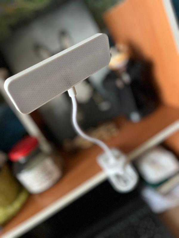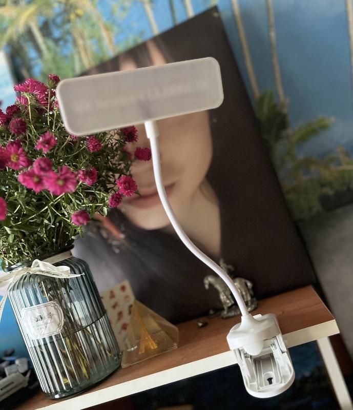 Затискна світлодіодна настільна лампа. Працює на акумуляторі, зарядка через USB, 3 режими світла. Висота лампи 30 см, разом із зажимом 36 см.