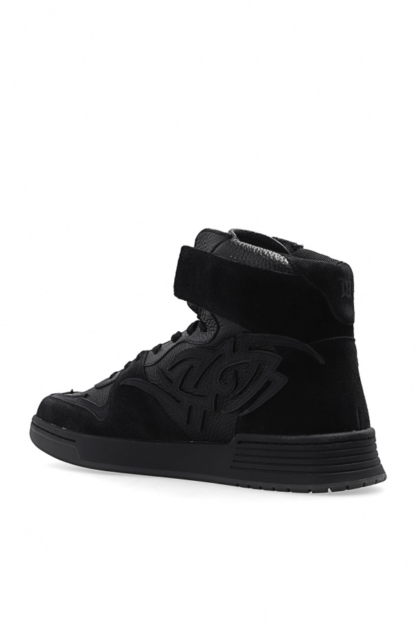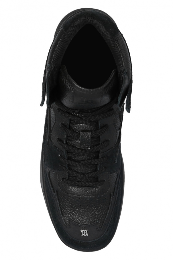 Black ‘Court’ high-top sneakers from MISBHV. Made of suede, this lace-up model features a tribal motif on the sides, distinctive silver-tone metal hardware on the front, a tactile black logo on the side and a black rubber sole at the base.