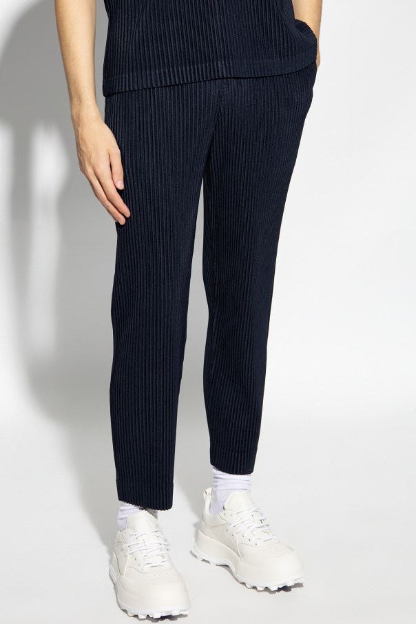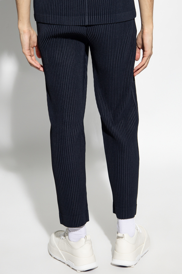 Navy pleated trousers from Issey Miyake Homme Plisse. This pair falls with tapered legs and features an elastic waistband with belt loops and two pockets.