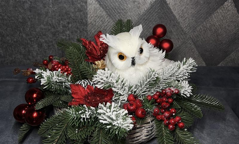 Виріб ручної роботи з красивою білою совою,вироблений в червоному кольорі з засніженими гілочками