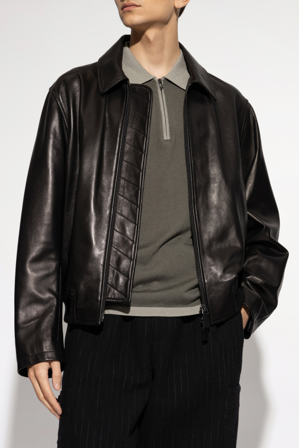 Introducing the quintessence of luxury and refined style, the Emporio Armani Leather Jacket. Crafted meticulously from 100% lamb leather, this jacket exudes an air of exclusivity and sophistication. Its black hue and smooth finish lend it an unparalleled elegance, making it a versatile addition to any wardrobe. The jacket's design is intentionally minimalistic, focusing on clean lines and an elegant aesthetic. Its tailored, tapered cut accentuates the silhouette, while the classic, flat collar draws inspiration from the timeless bomber and flight jacket styles. Central to its design is a robust double-ended zipper, ensuring durability and adding a touch of class. The cuffs and waistband are finished with a thick, elastic rib, providing an optimal fit and enhanced insulation. Attention to detail is evident in its precise, straight stitching, with vertical seams on the back further sculpting the form. Despite its minimalist design, the jacket features two snap-buttoned pockets for functionality without compromising style. Notably, the absence of visible logos or designer branding accentuates its sleek, minimalist appeal. Why Purchase This Product? Exclusive Material: Constructed from premium lamb leather for a luxurious feel and appearance. Sleek Design: Its clean, minimalist aesthetic is complemented by practical features such as a durable zipper and functional pockets. Versatile Elegance: The classic black color and sophisticated cut make it the perfect complement to any outfit, from casual to formal. Uncompromised Quality: Emporio Armani's commitment to quality is evident in every detail, from the choice of material to the execution of the design.