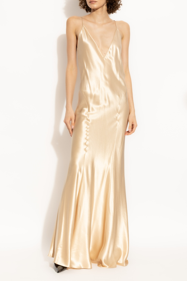 Experience the epitome of sophistication with our exclusive Silk Slip Dress from the renowned fashion house Saint Laurent. Designed with an impeccable eye for detail, this dress is a testament to timeless elegance and luxurious craftsmanship. Crafted from the finest silk, this dress boasts a smooth, lustrous finish that exudes opulence. Its body-hugging top transitions gracefully into a slightly flared skirt, creating a silhouette that flatters and enhances the natural curves of the body. The dress is floor-length, offering a regal presence for any evening occasion. The minimalist design features thin spaghetti straps and a V-neckline that mirrors both at the front and the back, adding a touch of allure. Thoughtfully placed darts and seams along the bust and waist accentuate the figure, ensuring a perfect fit. The dress is devoid of any visible logos or patterns, maintaining a clean and sophisticated look. Why Choose This Product? Exquisite material: 100% Silk for a luxurious feel and appearance. Timeless design: Elegant, minimalist style suitable for a variety of formal occasions. Flattering fit: Precision tailoring enhances and complements the body's natural shape. Iconic brand: Created by Saint Laurent, a name synonymous with high fashion and innovation.