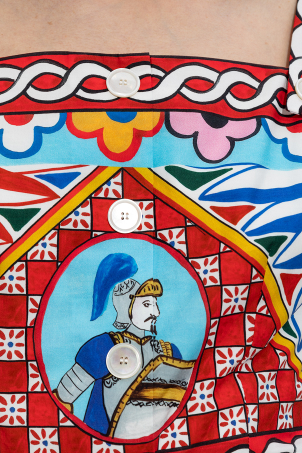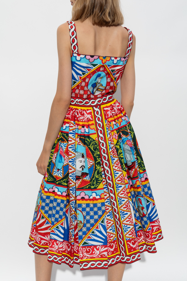 Introducing the "Caretto" Dress by the illustrious Italian fashion house Dolce & Gabbana. This mid-length masterpiece, belonging to the "WOMEN, CLOTHING, DRESSES, MID-LENGTH" category, epitomizes elegance and vibrancy. Crafted from the finest 100% cotton, it promises unparalleled comfort and breathability, perfect for those warm summer days. The dress boasts a classic silhouette with a fitted bodice and a flared skirt that gracefully falls to mid-calf. Wide straps enhance its timeless appeal. The multicolored, lively patterns are inspired by Mediterranean culture, featuring intricate geometric designs and stylized figures reminiscent of knights or historical characters, set against a mosaic-like background. Attention to detail is paramount, with a vertical button placket running down the front and a wave pattern adorning the neckline and straps. The rich color palette, dominated by vibrant reds, blues, greens, and whites, ensures that this dress stands out in any crowd. Why buy this product? Exquisite design by renowned fashion house Dolce & Gabbana High-quality 100% cotton for comfort and breathability Unique and vibrant patterns inspired by Mediterranean culture Classic silhouette with modern, artistic flair Perfect for making a stylish statement during summer