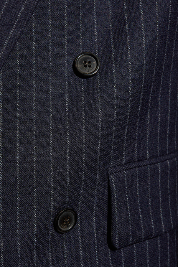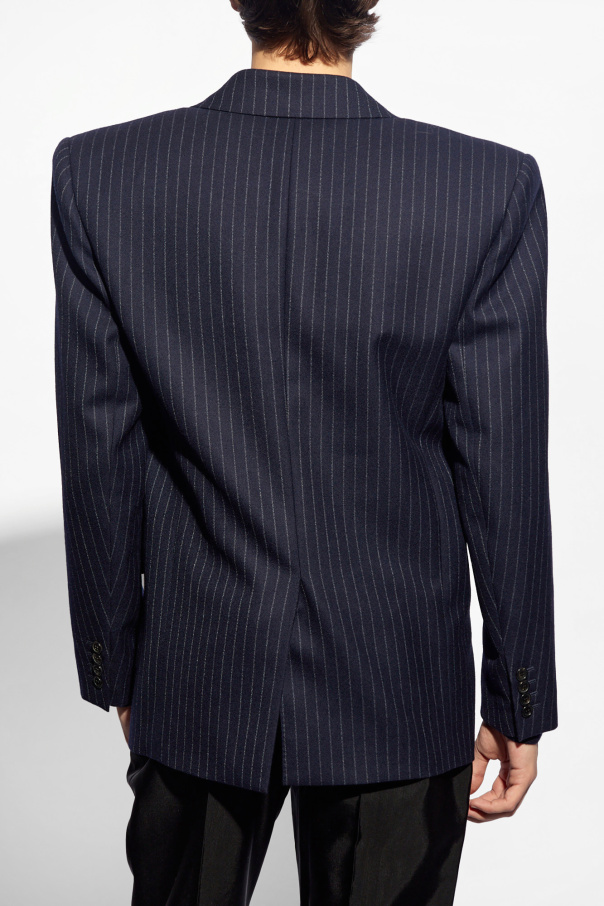 Navy blue blazer from Saint Laurent. Made from wool with a double-breasted silhouette, this style is embellished with light-coloured pinstripes and features a single back vent, button fastenings, peak lapels, one welt pocket, two flapped pockets, long sleeves and a silk lining.