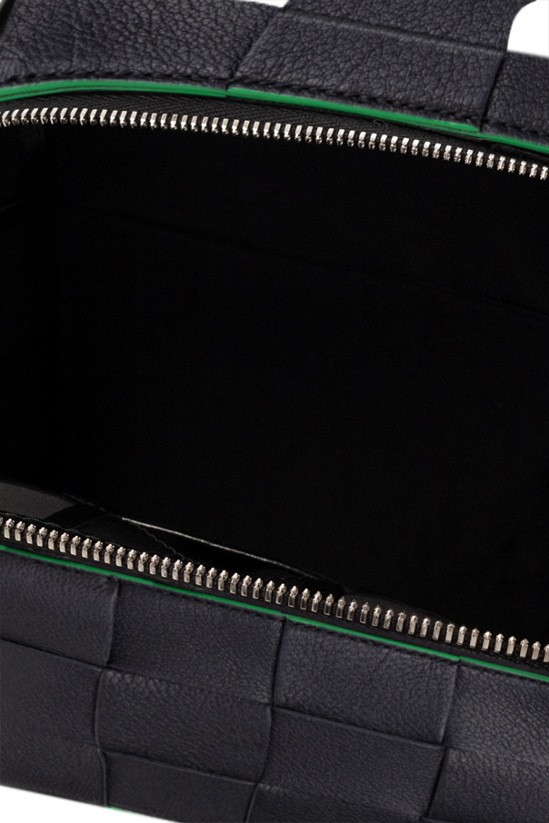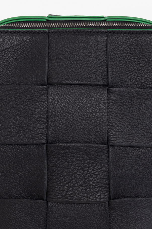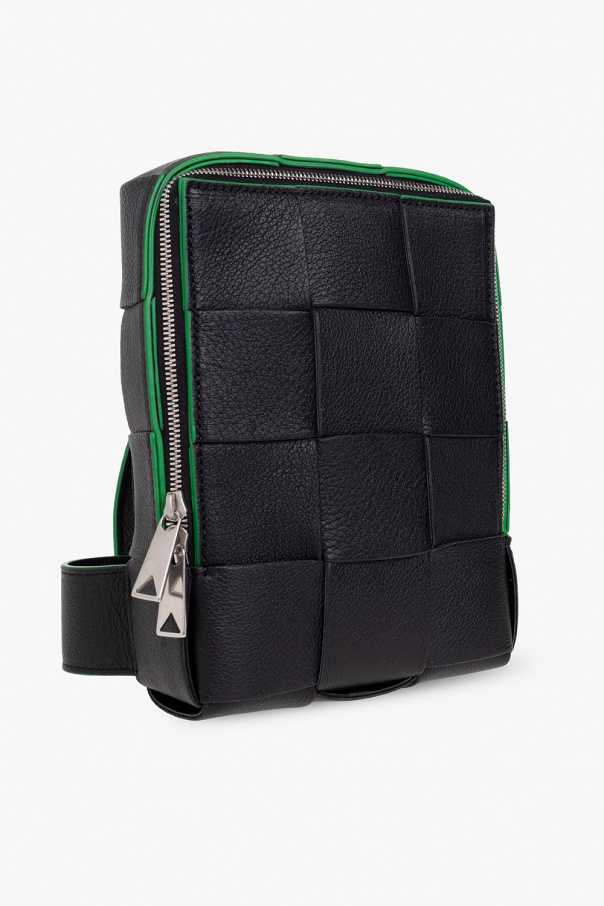 Black ‘Cassette Small’ belt bag from Bottega Veneta. Crafted from buffalo leather accentuated with the brand's signature Intreccio weave, this design secures with a two-way zipper and features an adjustable shoulder strap, green piping, silver-tone metal hardware and one internal compartment with two slip pockets.