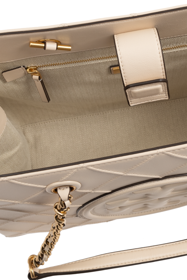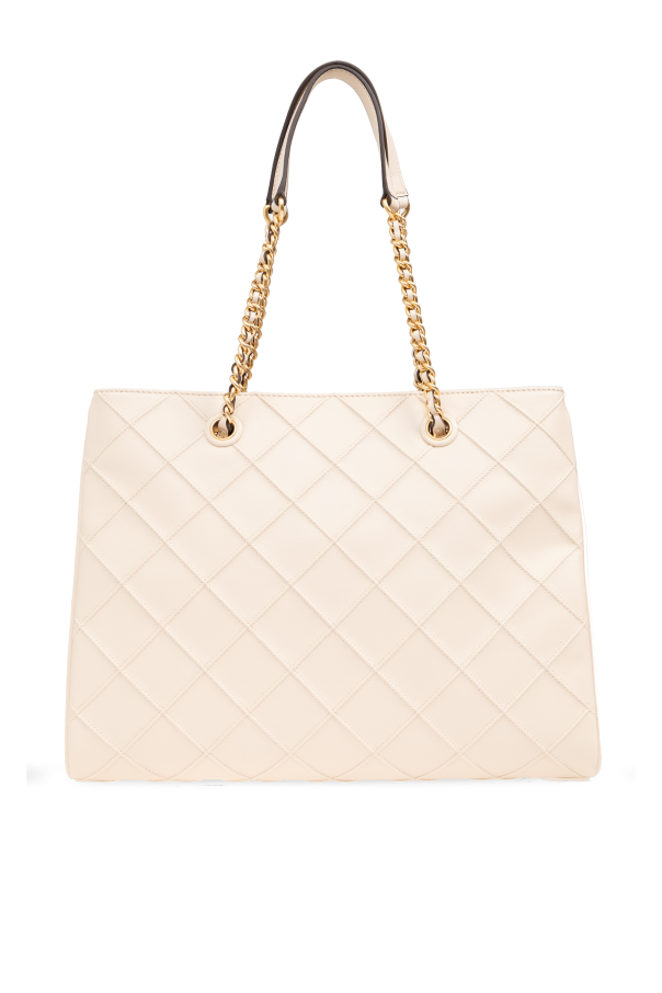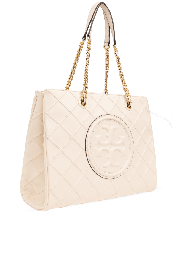 Introducing the Fleming Soft Shopper by Tory Burch, a paragon of elegance and practicality seamlessly woven into a single accessory. Crafted from 100% premium leather with a meticulously quilted pattern, this tote embodies sophistication with its creamy hue that complements any ensemble with ease. The bag's luxurious aura is elevated by its gold-tone chain handles and the iconic, rounded Tory Burch logo that sits proudly on its facade. Its construction showcases not only an unwavering attention to detail but also a commitment to functionality, featuring sturdy metal hardware, zippers, and internal pockets designed to cater to your every need. The interior reveals a spacious and well-organized compartment, inclusive of a secure zippered pocket and a slip pocket, all safeguarded by a reliable magnetic closure. The Fleming Soft Shopper transcends the ordinary with its blend of classic design and opulent details, making it an indispensable addition to the wardrobe of those who appreciate luxury without sacrificing utility. Why Purchase This Product? Elegant cream color, versatile for any outfit or occasion. Luxurious gold-tone chain handles and iconic Tory Burch logo accentuate its upscale design. High-quality quilted leather construction ensures durability and style. Functional interior with a zippered compartment, slip pocket, and magnetic closure for security and organization.