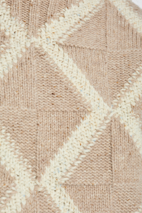 Introducing the epitome of sophistication and warmth: the Bottega Veneta Wool Turtleneck. Crafted from 100% pure wool, this turtleneck sweater is a luxurious addition to your wardrobe, designed to offer both comfort and style on cooler days. Its high collar is a nod to traditional elegance, while the relaxed fit brings a modern casualness that suits any occasion. The dominant beige hue of this garment is beautifully contrasted with large, diamond-shaped patterns in white or cream, creating an eye-catching effect against the beige fabric. These geometric accents not only enhance the visual appeal but also add a touch of uniqueness to the design. The sweater’s texture, visible in the detailed close-up, reveals the thickness and high quality of the fiber, indicating the meticulous craftsmanship behind this piece. The sleeves, long and slightly wide at the cuffs, contribute to the sweater's fashionable silhouette. The consistent diamond pattern on both the front and back of the sweater adds to its cohesive and refined aesthetic. Without visible logos or branding, the focus remains on the exquisite material and precision of the design, hallmarking it as a product of the renowned Bottega Veneta. Why Purchase This Product? Elegant and timeless design suitable for various occasions Made from 100% high-quality wool for utmost comfort and warmth Unique diamond-shaped pattern adds a sophisticated touch Loose fit and stylishly wide cuffs embody modern elegance Exemplary craftsmanship from the distinguished Bottega Veneta