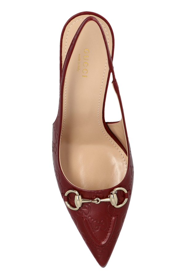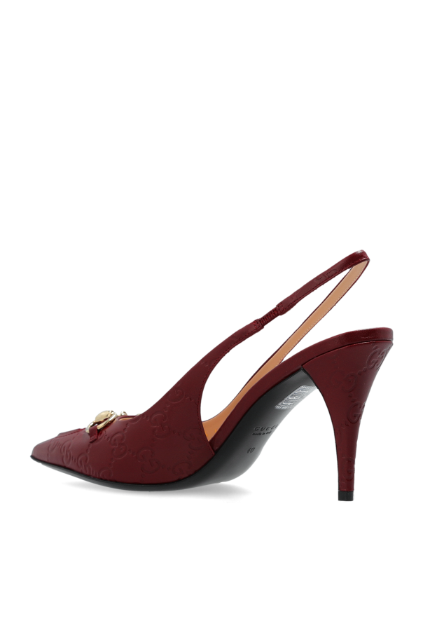 Introducing the Leather High-Heel Shoes, epitomizing sophistication and impeccable style. Crafted by the esteemed house of Gucci, these exquisite heels are a testament to the brand’s commitment to luxury and innovation under the visionary guidance of Alessandro Michele. Featuring a classic shape with a pointed toe and open back, these slingback stilettos are constructed from premium burgundy leather adorned with an intricate embossed pattern, exuding elegance and refinement. A striking gold-toned metal embellishment, reminiscent of a knot, graces the front, adding a touch of opulence and distinction. The interior showcases the iconic gold Gucci logo, a hallmark of authenticity and prestige. The slender, high heel accentuates the shoe’s graceful silhouette, making it an ideal complement to any sophisticated ensemble, infusing it with a luxurious aura. Why Choose These Shoes? Exquisite Design: Classic yet contemporary styling with a pointed toe. Premium Material: Made from high-quality burgundy leather with an embossed pattern. Distinctive Detailing: Gold knot embellishment for a unique touch. Iconic Branding: Features the prestigious Gucci logo inside. Elegant Elevation: High heel for an elongating effect.