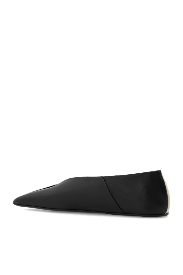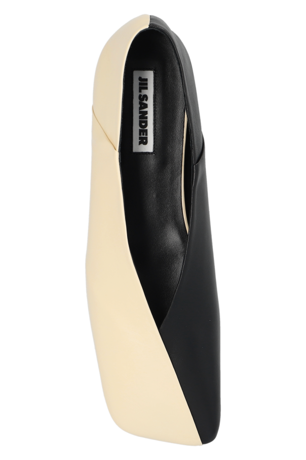 Cream and black shoes from JIL SANDER. Made of leather with a distinctive shape, this model sits on a black leather sole and showcases a stripe pattern.