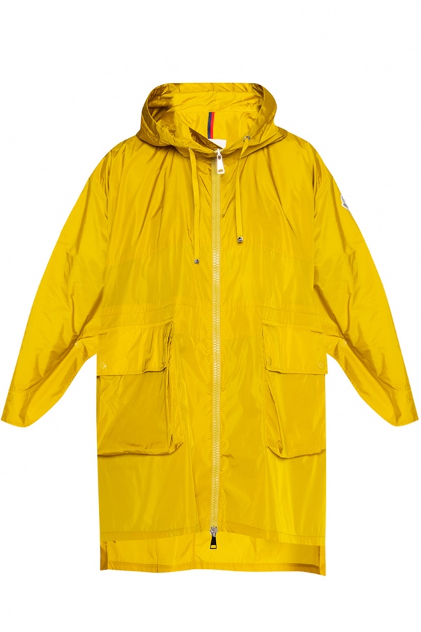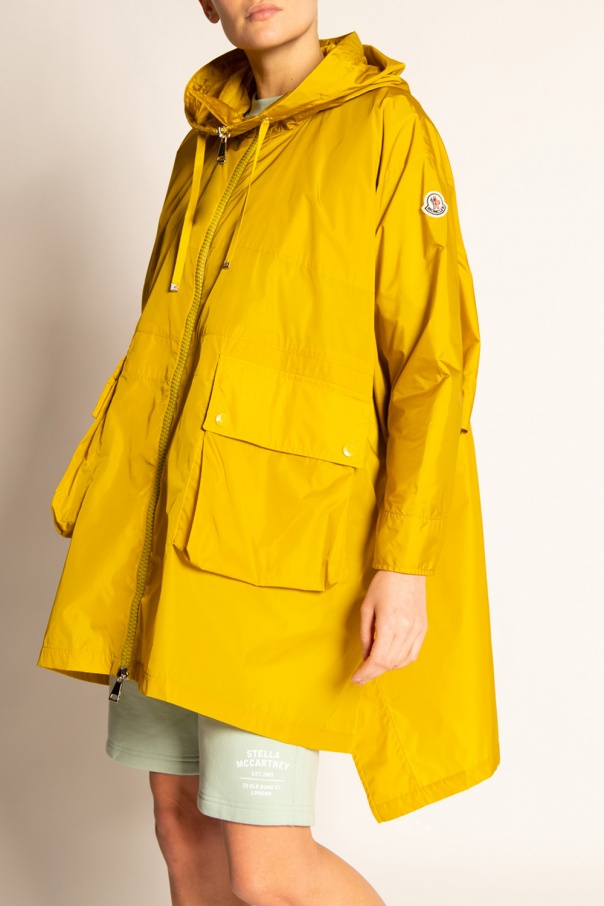 Orange ‘Printseps’ cape from Moncler. Fastened with a two-way zip on the front and via snaps on the sides, this design features a drawcord-adjustable hood, two snap-fastened pockets on the front, and cropped sleeves, one of which has a colourful logo patch.