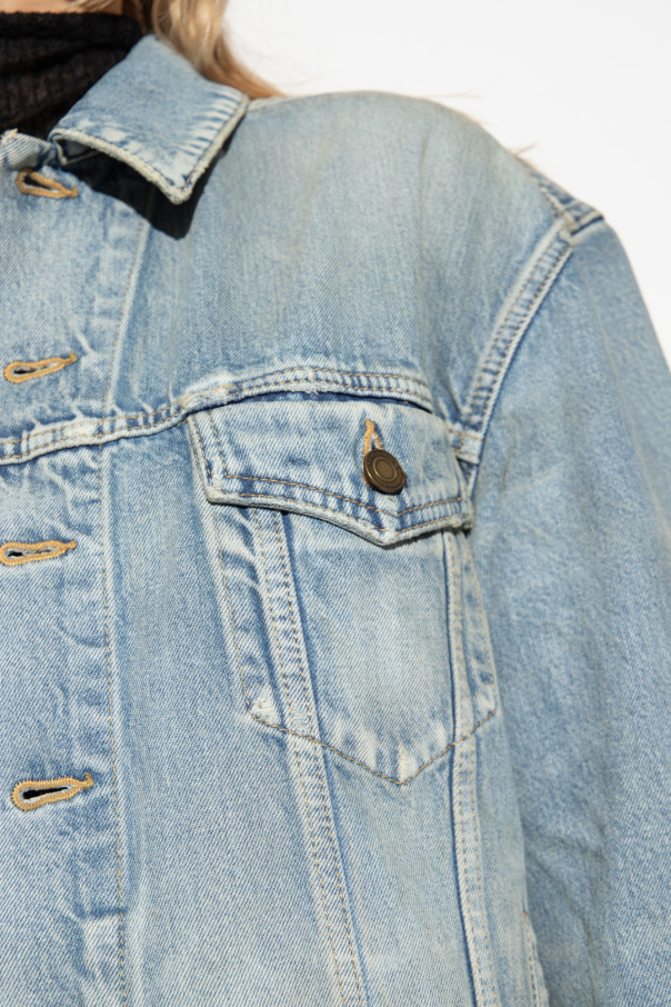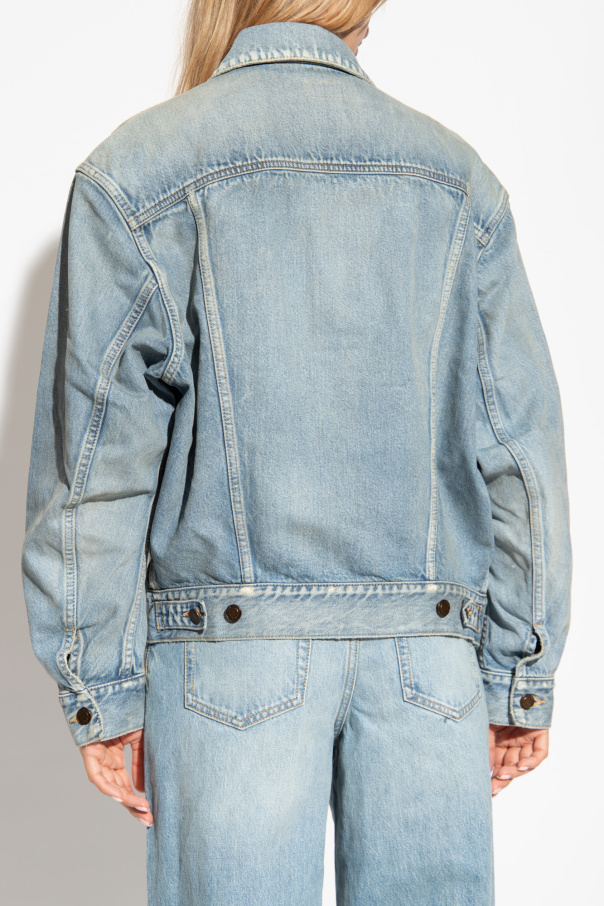 Blue denim jacket from Saint Laurent. Made from organic cotton with an oversize fit, this style features button fastenings, two welt pockets, two flapped pockets with buttons, distressed detailing and long sleeves with button cuffs.